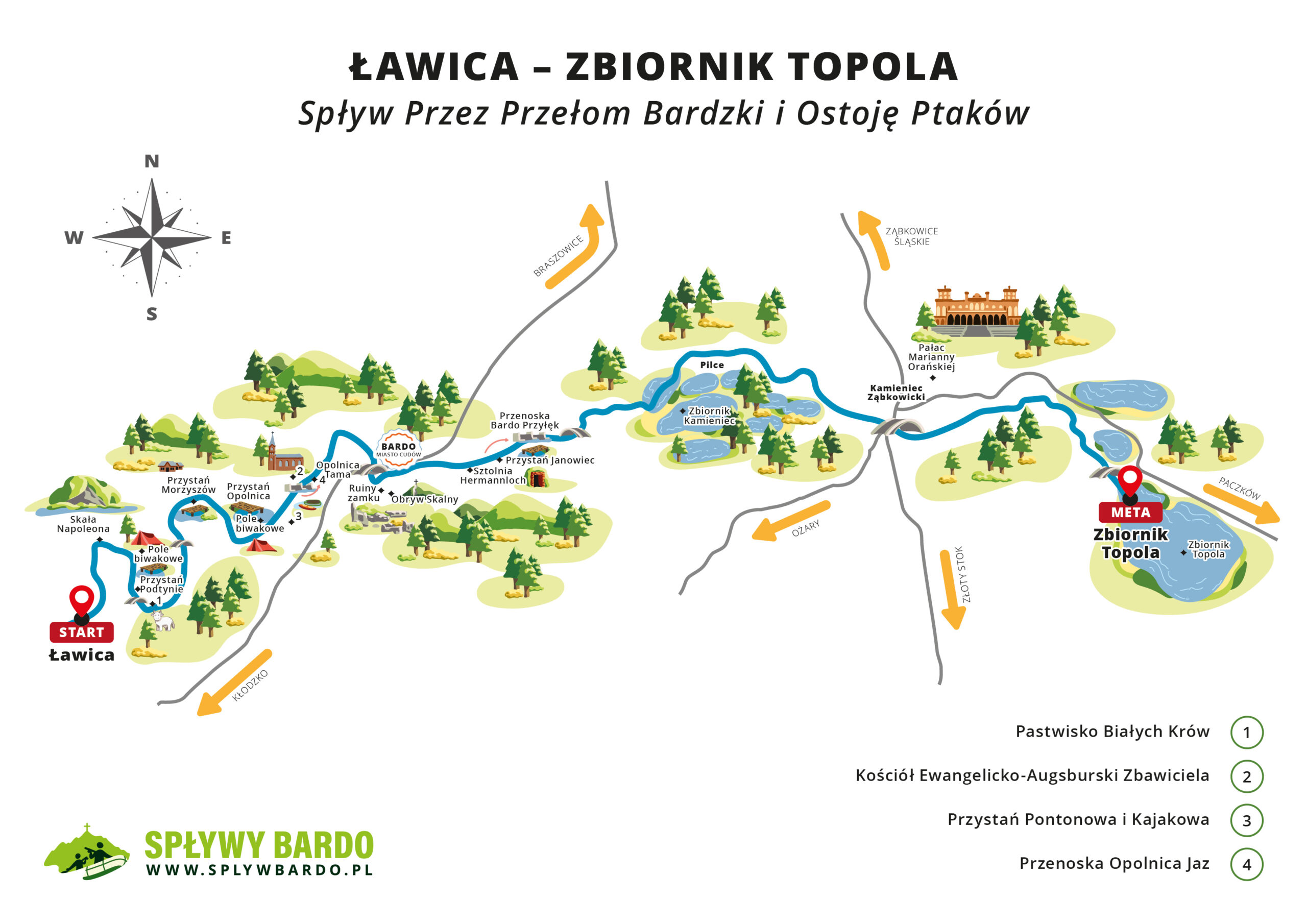Jest to połączenie spokojnego spływu widokowego Przełomem Bardzkim na Nysie Kłodzkiej oraz wymagającego odcinka Ostoja Ptaków. Cały jednodniowy spływ kajakowy to propozycja dla doświadczonych kajakarzy, którzy szukają wyzwania oraz emocjonującej przygody na rzece Nysa Kłodzka. Spływ kajakowy Bardo rozpoczyna się w Ławicy, a kończy na Zbiorniku Topola.